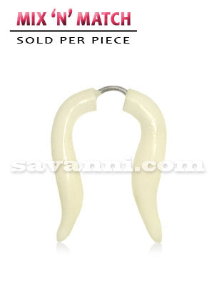 Det här slående fake clip-on septumsmycket ser ut som ett äkta septum-piercingsmycke men du behöver inte ha ett piercinghål i näsan för att använda smycket. Det här häftiga fake septumsmycket sätts fast med clips och septumsmycket kan således användas utan piercing. Fake septumsmycket är lätt och bekvämt att använda och fake septumsmycket varken kniper eller trycker i näsan. Fake septumsmycket fästs i näsan så att smycket placeras i den tunnaste delen av septum och sedan låter man det glida ner till den tjockaste delen av septum så att smycket fastnar och blir att hänga i septum.