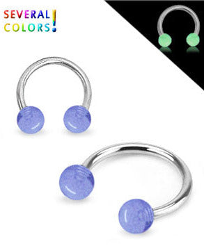 En 1.2mm tjock svart hästskobarbell som försetts med kulor som lyser i mörkret. Piercingsmycket kan användas i många olika slag av piercingar. Storleken på hästskons diameter och färgen på de självlysande kulorna kan väljas i undermenyn.
