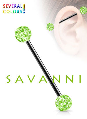 Det här långa piercingsmycket kan användas i en industrialpiercing. Industrial-smyckets svarta stav har gjorts av kirurgiskt stål och försetts med vackert glittrande crystal-kulor i stavens båda ändor. Industrial-smyckets glitterkulor har överdragits med en transparent film som försäkrar att kulornas små gnistrande stenar inte lossnar.