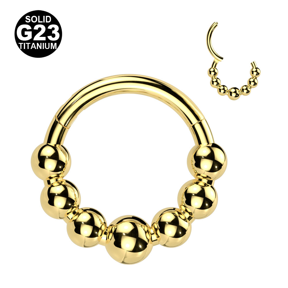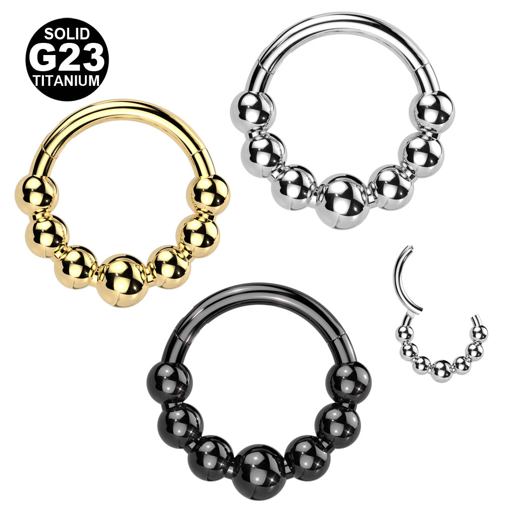 Saranamallinen titaanirengas, jota reunustaa pallokoristeet. Monikäyttöinen lävistysrengas sopii käytettäväksi mm. korvassa tai nenässä. Renkaan paksuus on 1.2mm ja halkaisijan koko 8mm tai 10mm. Saatavilla eri väreissä.