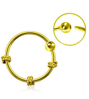En rödguldfärgad silverring som smyckats med en detalj i form av en järntråd och som försetts med ett kullås. Den här ringen är gjord av silver och kan användas bland annat som nässmycke eller som örhänge. Silverringen öppnas genom att töja på den och ringens lås placeras inne i kulan så att det inte syns.