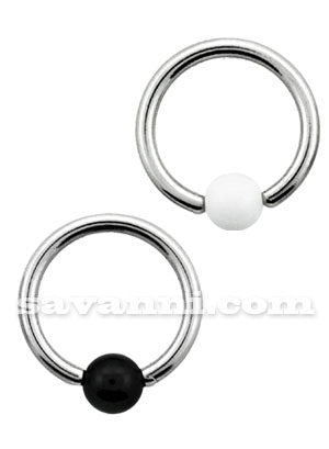 Vihdoinkin paksu ja jykevä lävistysrengas, joka on miellyttävä ja helppo käyttää! Tämä rengas ei tarvitse lävistyspihtejä eikä näppivoimiakaan, koska renkaan keskellä oleva pallo on toisesta päästään kierteillä kiinni varressa. Rengas on laadukasta titaania, joten se on myös huomattavasti kevyempi kuin saman paksuiset kirurginteräsrenkaat. Saatavilla eri paksuuksia, pallon koko vaihtelee paksuuden mukaan. Renkaan sisähalkaisija on 12mm. Hinta on kappalehinta.