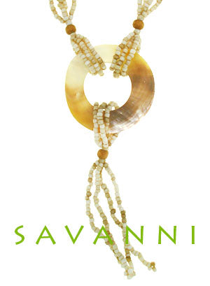 Pärlorna har gjorts av trä och snäcka. Bandet har gjorts av bomull.